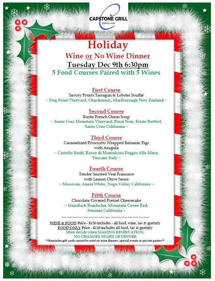 "Excellent dinner, the salmon bisque was to die for. Service was great... I highly recommend Capstone Grill for fresh seafood."